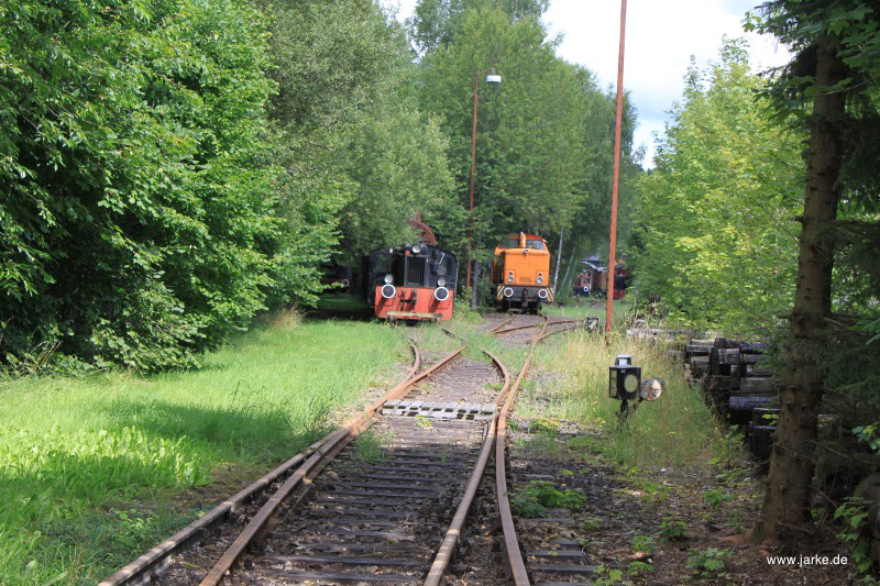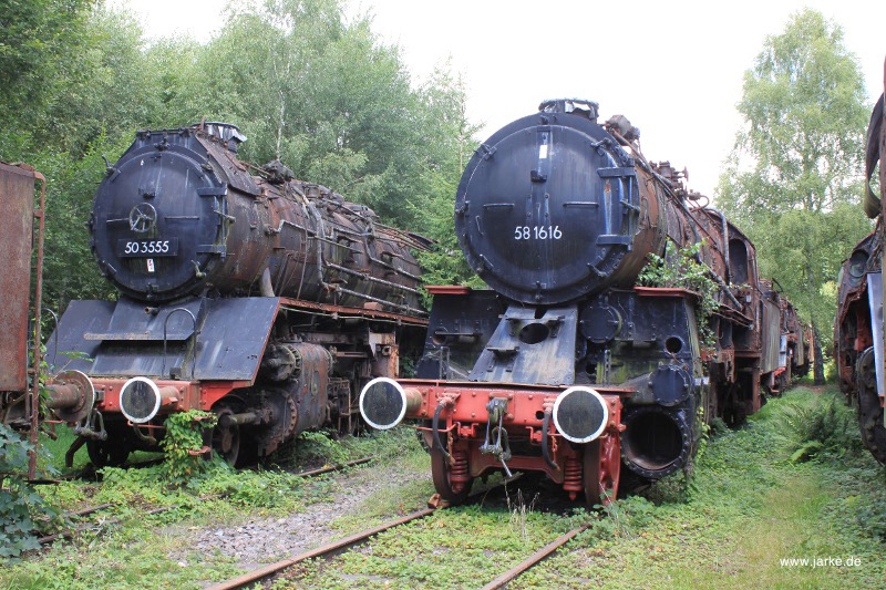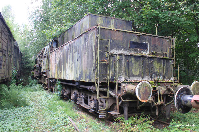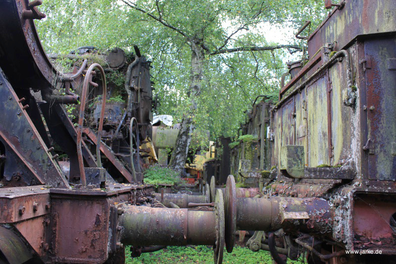 Ohne schützendes Dach schreitet der Verfall der Loks voran. Einige Fahrzeuge sind daher großflächig mit Moos bewachsen. Teils wachsen sogar Bäume aus dem Fahrwerk und Zylindern heraus. Jeder von uns kennt nicht-gepflegte Denkmalloks. Da im Außengelände allerdings 44 (!) Loks in den verschiedensten Zuständen verfallen (fast nur schwere Güterzugdampfloks, nur wenige kleine Dieselloks sind hierzu finden), hat das Gelände daher den *Charme* eines Lokfriedhofs.