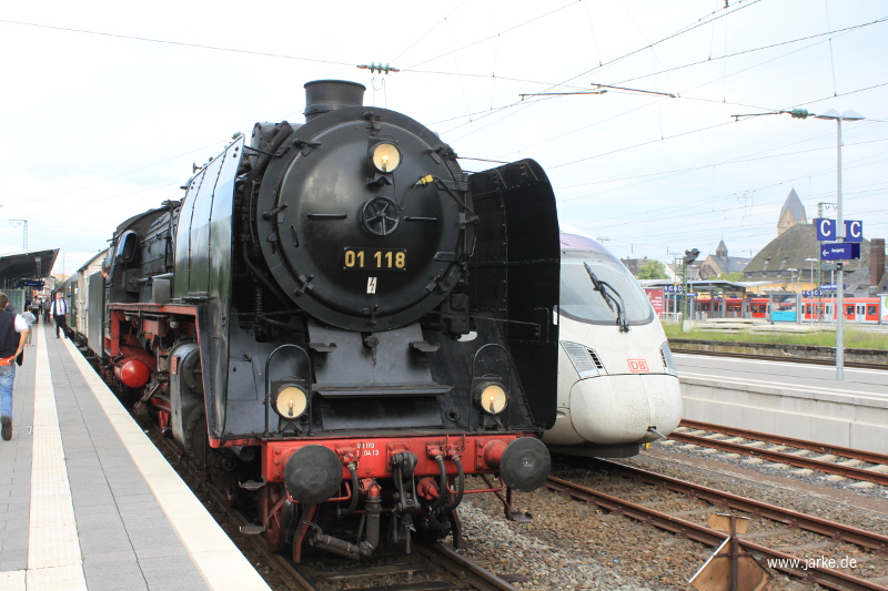 Seit 1981 wird 01 118 für Sonderfahrten genutzt, zunächst auf der Frankfurter Hafenbahn, seit 1985 auch auf öffentlichen Bahnstrecken. - unterwegs mit 52 4867