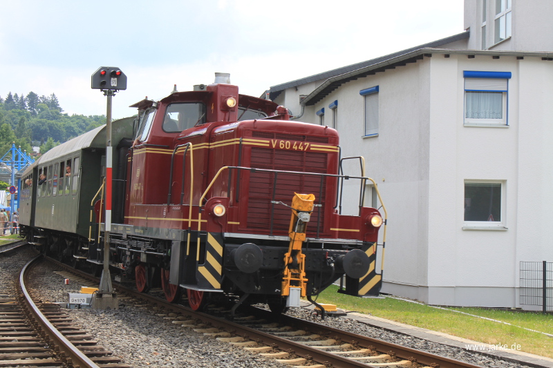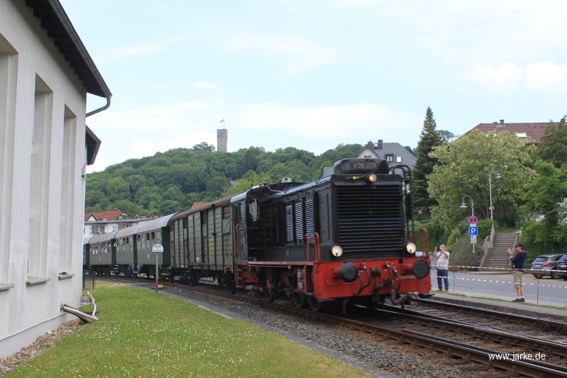 Am Pfingstsonntag und -montag waren beide Dampfloks, die wieder betriebsfähige vereinseigene V36 406 und einer angemieteten V60 447 in altroten Bundesbahn Lackierung auf der Taunusbahn von Frankfurt Höchst nach Königstein unterwegs. Im Stundentakt waren die Züge auf der Strecke unterwegs - mit Zugkreuzung in Hornau. In diesen Jahr war 01 118 für Führerstandsfahrten im Bahnhof Königsstein eingeplant. Am letzten Zug des Tages kam es zur Dampflok - Doppeltraktion - mit der 52 4867 am einen, mit 01 118 am anderen Zugende.