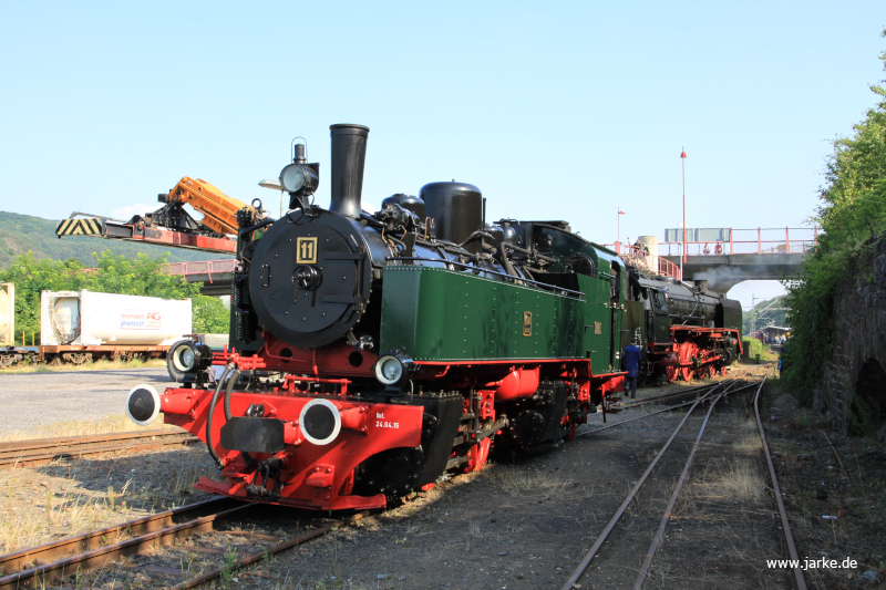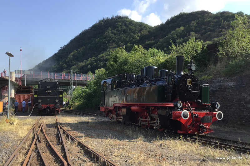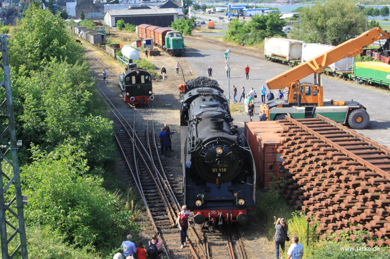 Unterwegs wurde wiederholt gestoppt. Zum einen waren verschiedene Ein- und Ausstiegsbahnhöfe vorgesehen. Zum anderen wurde auf Hin- und Rückfahrt Wasser nachgetankt. Aus technischen Gründen (Knick im Schlauch, zu dünner Schlauch?) dauerte das Wasserfassen in Neuwied zu lange. Mit ca. 45 Minuten Verspätung wurde Köln erreicht. Zeit für Fotos von der Lok im Bahnhof blieb daher nicht. Besser als geplant verlief das zweite Wasserfassen in Brohl. Auf dem Umladebahnhof der Brohltalbahn gab es einen besonderen Besucher : 11sm schaute vorbei. Die einzige erhaltene und auch betriebsfähige Dampflok der Brohltalbahn fuhr über die Dreischienengleise zur 01 118 und ermöglichte besondere Fotos. Eine glückliche Fügung, denn durch die Verspätung konnte 11sm nach den letzten Dampfzug und den folgenden Rangierarbeiten im Brohltalbahn Bahnhof in Richung Hafen fahren und diese Fotos ermöglichen.