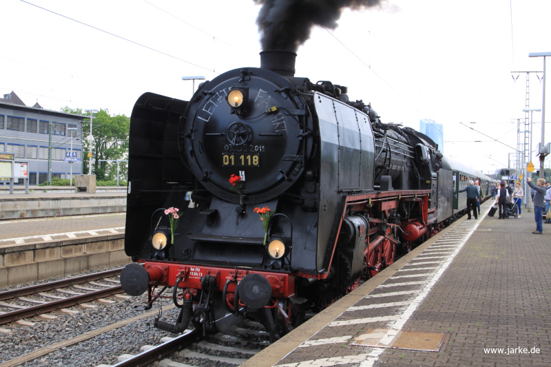 Am 3. August 2019 fuhr 01 118 zum letzten Mal einen Sonderzug für die Historische Eisenbahn Frankfurt. Verstärkt um Rheingold Express Wagen der FEK fuhr 01 118 den Sonderzug FD Rheingold rechtsrheinisch nach Köln und linksrheinisch zurück nach Frankfurt/Main Südbahnhof. Der 11 Wagen lange Zug wurde hinten von der E-Lok 140 003-5 unterstützt.