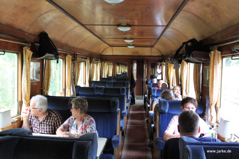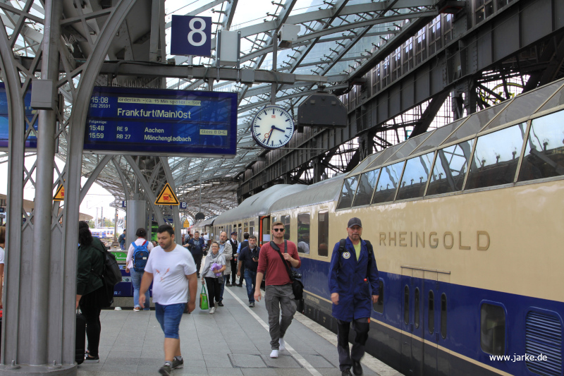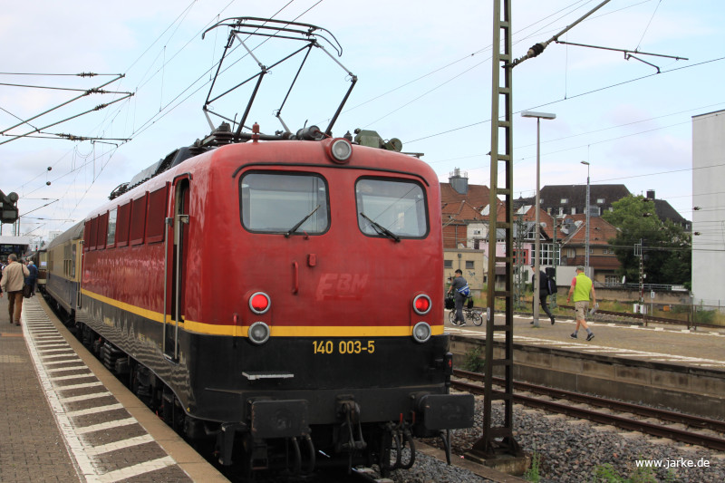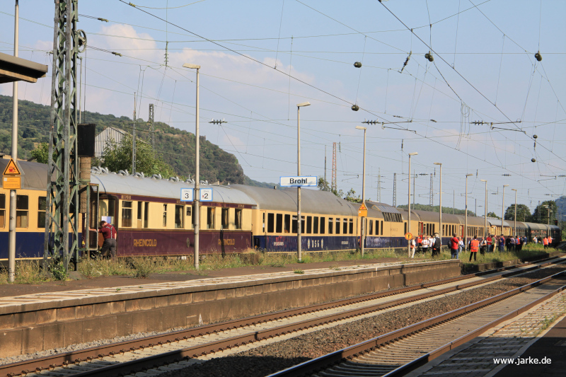 Die letzte Sonderfahrt fand am Tag zuvor statt - am Samstag, den 3.8.2019. Für diese Fahrt wurden die 4 HEF Wagen vom Typ BM234 um 7 weitere Wagen vom FEK ergänzt - Rheingold Express Wagen aus den Jahren 1928 und 1962, inklusive Aussichtswagen und Buckelspeisewagen sowie den beiden betriebsfähigen 1928er Wagen (1. Klasse Salonwagen und 2. Klasse Abteilwagen). Am Zugende fuhr 140 003-5 mit, die für die Stromversorgung der Wagen benötigt wurde. Die Fahrt fand als FD Rheingold rechtsrheinisch nach Köln und linksrheinisch zurück nach Frankfurt / Main Südbahnhof statt.