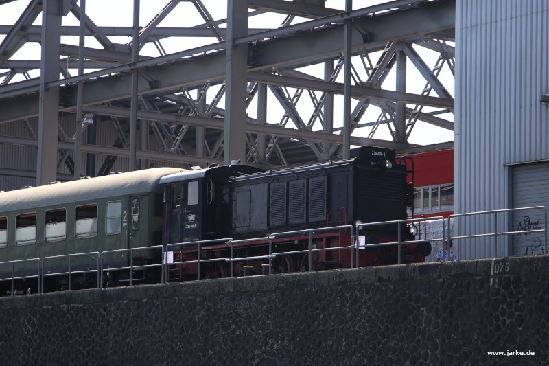 Anläßlich des Osthafenfestivals 2022 pendelte die Historische Eisenbahn Frankfurt auf der Hafenbahn vom Eisernen Steg zum Osthafen. Zum Einsatz kam die Diesellok V36 406 mit der HFM Lok D1 vom Typ Krauss-Maffei MH 05 Diesel, die mit 3 Personenwagen unterwegs waren.