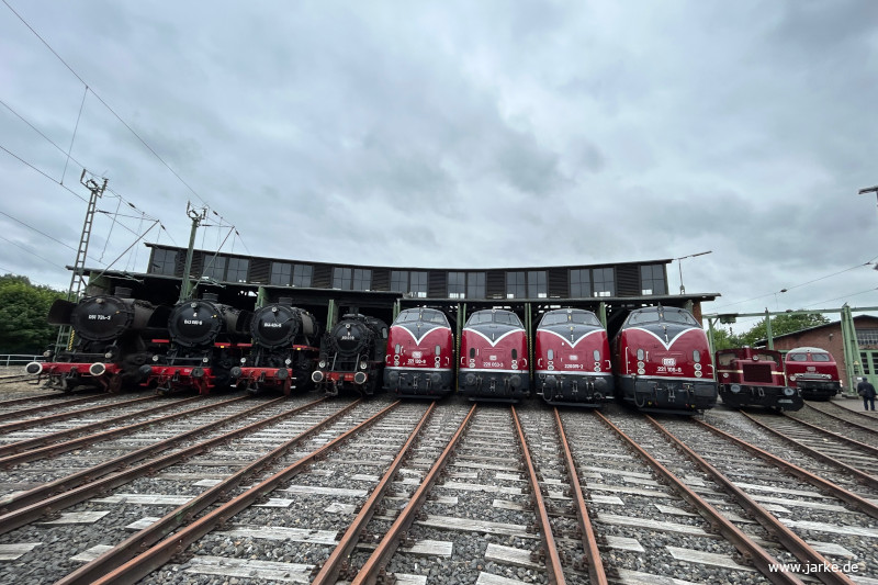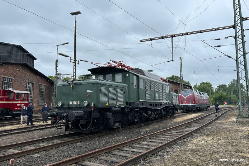 Aus Eisenbahnfan Sicht war die Öffnung vom früheren Bahnbetriebswerk, direkt vom Bahnsteig aus zu erreichen, DAS Highlight. Neben den Fahrzeugen der Hammer Eisenbahnfreunde (194 158-2, 212 079-8 und 220 033-5) waren hier die Exponate vom privaten Eisenbahnmuseum zu sehen, die sonst nicht zugänglich sind. Das vorbildlich gepflegte Gelände mit seiner Drehscheibe, den Ringlokschuppen und Rechtecklokschuppen war alleine schon sehenswert. Aber erst die Exponate! ZWEI Dampfloks der Bundesbahn Baureihe 44 (Öl- UND Kohlegefeuert, 043 681-6 und 044 424-0), eine Bundesbahn 50er (051 724-3), 80 039 sowie VIER V200 (V200.0 UND V200.1, 220 015-2, 220 053-3, 221 120-9 und 221 106-8) wurden ausgestellt. Dazu konnten noch eine Köf 3, 280 007-6 sowie die Lolo V160 006 (eine der Voserienloks) angeschaut werden.