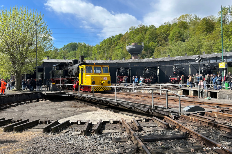 Auf der Drehscheibe wurden im Tagesverlauf immer wieder andere Dampfloks gedreht. Kurios war die Präsentation von 01 008, die mit Tender zu lang für die 20 Meter Drehscheibe ist. Die Lösung war das Abkuppeln vom Tender, die einen direkten Einblick auf den Führerstand ermöglichte.