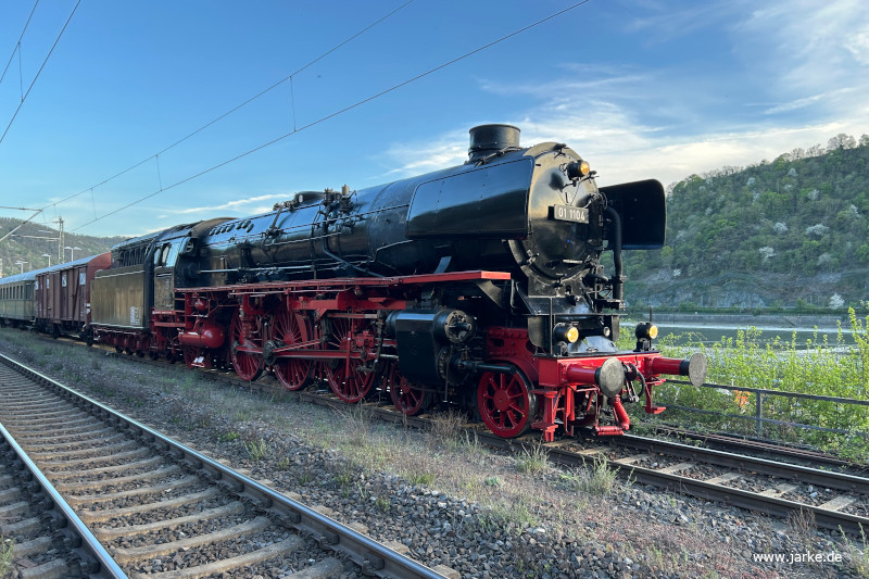 Im Auftrag von Nostalgiezugreisen.de war 012 104-6 am 12.4.2025 vor einen langen D-Zug unterwegs und machte in Kaub am Rhein, nur wenige Meter von der Pfalzburg im Rhein entfernt, einen Wasserhalt.