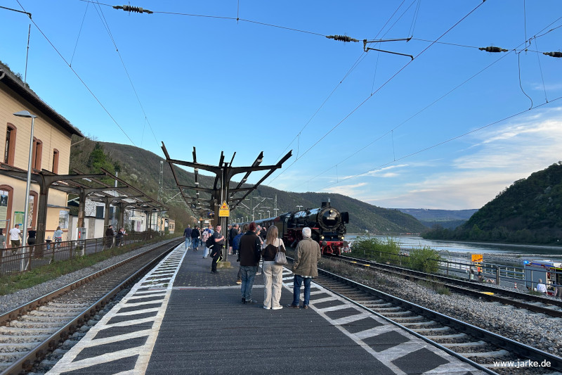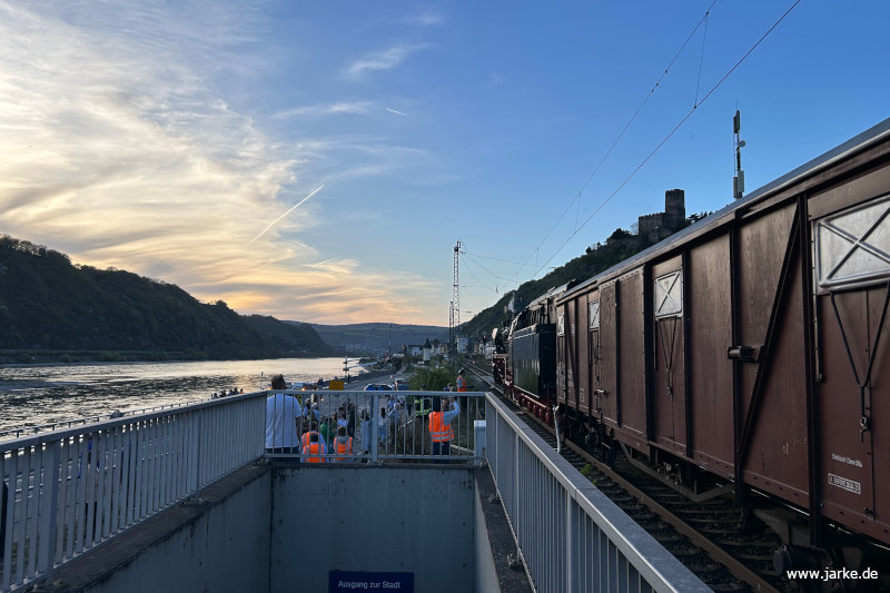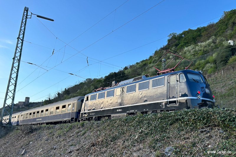Die Rückfahrt ab Würzburg erfolgte mit 110 350-6 am Zugende. Ab Köln übernahm sie wieder den Zug. Unterwegs war ein Wasserhalt in Kaub vorgesehen, unweit der Pfalzburg. Die Fahrgäste konnten hier aussteigen und auch Fotos machen. Zuglängenbedingt (10 Personenwagen plus Speisewagen plus Hechtwagen für das Lokpersonal plus Güterwagen) war die 110er zu weit vom Bahnsteig entfernt und schwer zu fotografieren.