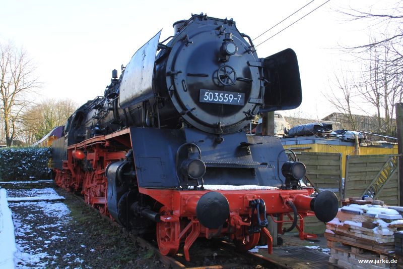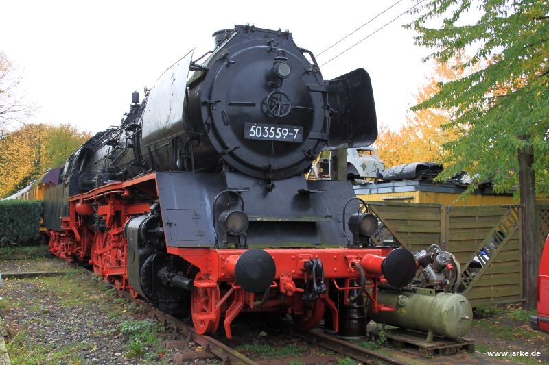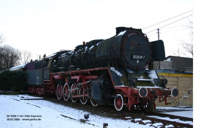 50 3559 wurde 1940 gebaut. 50 3559 fuhr am 29.10.1988 den letzten planmäßigen Regelspur-Dampfzug in Deutschland auf der Strecke Magdeburg - Halberstadt - Thale. Im Anschluß wurde sie als Heizlok verwendet. Später erfolgte die Aufarbeitung als Denkmallok. Ab November 1991 stand die Lok zusammen mit früheren Bauzugwagen und Salonwagen auf einem Gleis im ehemaligen Güterbahnhof von Erftstadt Liblar. Für die Überführung mußte sogar ein Notgleis auf dem zurückgebauten Gelände verlegt werden. Der Zug wurde zum Bistro umgebaut und ist als Ville-Express überregional bekannt. Die Lok leidet unter den Problem aller ungeschützt abgestellten Loks : die Witterung setzt der Lok zunehmend zu. Viele Bleche sind längst zu Staub zerfallen. Ein Besuch vom Führerstand der Lok ist leider nicht zu empfehlen. Die Lok wurde in den Jahren 2011/2012 äußerlich durch eine neue Lackierung optisch aufgewertet. Das Umfeld des Zuges erinnert leider an einen Schrottplatz.