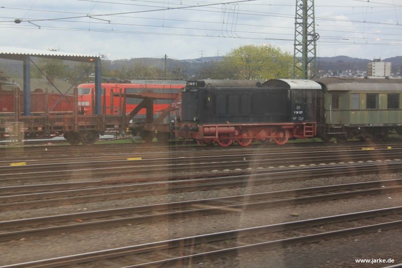 Beim Zwischenstopp nahe dem Koblenzer Museum (der Zug stand im Güterbahnhof - ohne Ausstiegsmöglichkeit, während die Lok im Museum Wasser tankte) ergab sich der Blick auf verschiedene Neuheuten im Museum ... von links nach rechts : zweite Köf von links aus betrachtet ist Ka 4862 aus Köln (ex 381 005; sie war dort seit Ewigkeiten im Bw Köln 2 eingesetzt - dort habe ich sie in den 80er Jahren beim Schulpraktikum erleben dürfen, damals noch anders lackiert; die Reperatur vom defekten Akku wird wohl nicht vorgenommen), daneben die neue Lokhalle und am rechten Bildrand die V36 107 aus Bremen (Motor- oder Getriebedefekt ... eine Reperaturmöglichkeit wird zumindest geprüft). Bisher habe ich einige V36 in den verschiedensten Zuständen in Museen erlebt, aber nur eine einzige betriebsfähige ... nein.