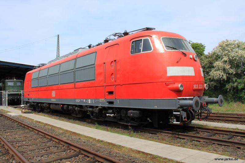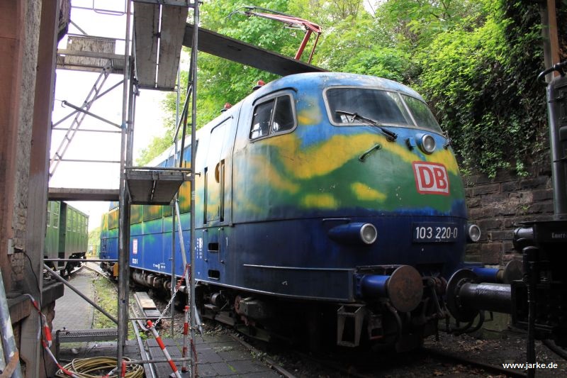 Update 14.05.2014: Das DB Museum Koblenz kündigte im Mai 2014 auf seiner Facebook Seite an, das die Abholung der 103 220 in Neustadt an der Weinstraße in den nächsten Tagen erfolgen wird. Eine Prüfung hatte ergeben, das die Lok mit bis zu 80 km/h Geschwindigkeit geschleppt werden kann. Am 12.05.2014 erfolgte die Überführung im Sonderzug - bestehend aus E40 128, 103 220 und einen Bm Reisezugwagen als Bremswagen. Was die Mitarbeiter mit der Lok im Museum machen werden, ist - so der letzte mir bekannte Stand - noch nicht absehbar. Die Lok ist damals aus eigener Kraft nach Neustadt an der Weinstraße gefahren. Zwischenzeitlich sollen keine Teile ausgebaut worden sein. Vielleicht ist das eine gute Basis für eine spätere betriebsfähige Aufarbeitung. Es ist die einzige Lok der Baureihe 103, die im Touristikzug Design unlackiert wurde. Über eine neue HU und eine Rückkehr in den aktiven Dienst wurde in den Bahnforen viel spekuliert. 103 220 wird bereits zum Sommerfest 2014 des Koblenzer Museums ausgestellt werden.