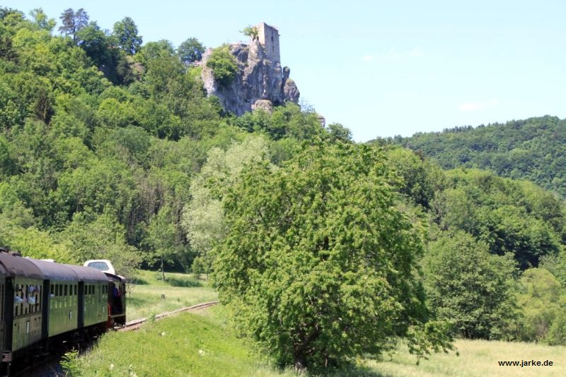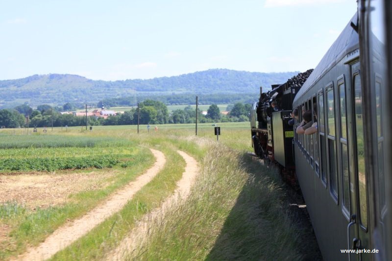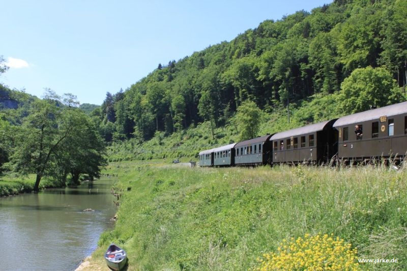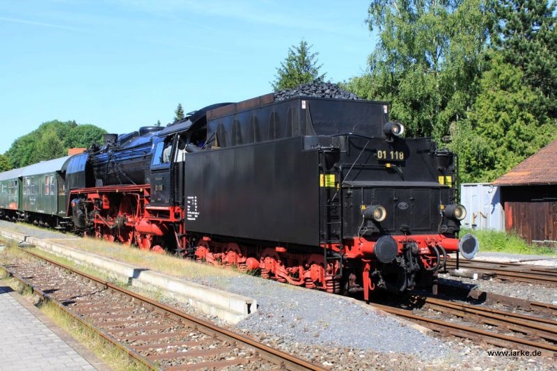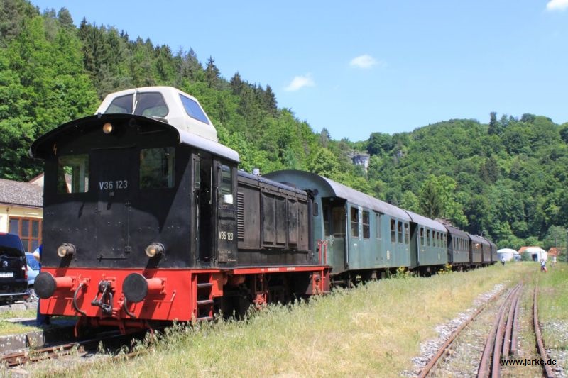 Am 4. Juni 2015 fuhr 01 118 nach Ebermannstadt. Dort bestand die Möglichkeit mit der Dampfbahn Fränkische Schweiz zu fahren. Am Fronleichnam war auf der Museumsbahnstrecke Ebermannstadt - Behringersmühle die Diesellok V36 123 mit mehreren Donnerbüchsen und zwei Umbau-Wagen 3yg unterwegs. V36 123 hat einen Hochführerstand mit Dachkanzel.